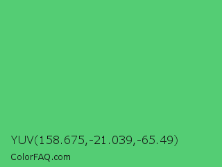 YUV 158.675,-21.039,-65.49 Color is a normal green color and the nearest color is Emerald #50c878. Hex code #54cd74 and RGB value is rgb(84,205,116). In RGB color space, this color is composed of 33% red, 80% green, 45% blue, In CMYK color space, this color is composed of 59% cyan, 0% magenta, 43% yellow , 20% black , In HSL color space, this color has a hue angle of 136° , 55% saturation and 57% lightness.