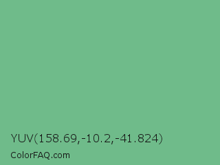 YUV 158.69,-10.2,-41.824 Color is a normal green color and the nearest color is Silver Tree #66b58f. Hex code #6fbb8a and RGB value is rgb(111,187,138). In RGB color space, this color is composed of 44% red, 73% green, 54% blue, In CMYK color space, this color is composed of 41% cyan, 0% magenta, 26% yellow , 27% black , In HSL color space, this color has a hue angle of 141° , 36% saturation and 58% lightness.