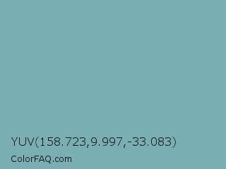 YUV 158.723,9.997,-33.083 Color is a normal cyan color and the nearest color is Gulf Stream #80b3ae. Hex code #79aeb3 and RGB value is rgb(121,174,179). In RGB color space, this color is composed of 47% red, 68% green, 70% blue, In CMYK color space, this color is composed of 32% cyan, 3% magenta, 0% yellow , 30% black , In HSL color space, this color has a hue angle of 185° , 28% saturation and 59% lightness.