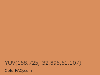YUV 158.725,-32.895,51.107 Color is a light orange color and the nearest color is Persian Orange #d99058. Hex code #d98e5c and RGB value is rgb(217,142,92). In RGB color space, this color is composed of 85% red, 56% green, 36% blue, In CMYK color space, this color is composed of 0% cyan, 35% magenta, 58% yellow , 15% black , In HSL color space, this color has a hue angle of 24° , 62% saturation and 61% lightness.