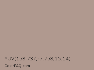 YUV 158.737,-7.758,15.14 Color is a light orange color and the nearest color is Del Rio #b09a95. Hex code #b0998f and RGB value is rgb(176,153,143). In RGB color space, this color is composed of 69% red, 60% green, 56% blue, In CMYK color space, this color is composed of 0% cyan, 13% magenta, 19% yellow , 31% black , In HSL color space, this color has a hue angle of 18° , 17% saturation and 63% lightness.