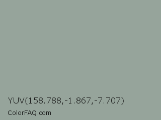 YUV 158.788,-1.867,-7.707 Color is a light green color and the nearest color is Pewter #96a8a1. Hex code #96a49b and RGB value is rgb(150,164,155). In RGB color space, this color is composed of 59% red, 64% green, 61% blue, In CMYK color space, this color is composed of 9% cyan, 0% magenta, 5% yellow , 36% black , In HSL color space, this color has a hue angle of 141° , 7% saturation and 62% lightness.