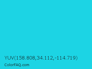 YUV 158.808,34.112,-114.719 Color is a normal cyan color and the nearest color is Bright Turquoise #08e8de. Hex code #1cd4e4 and RGB value is rgb(28,212,228). In RGB color space, this color is composed of 11% red, 83% green, 89% blue, In CMYK color space, this color is composed of 88% cyan, 7% magenta, 0% yellow , 11% black , In HSL color space, this color has a hue angle of 185° , 79% saturation and 50% lightness.