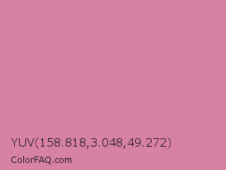 YUV 158.818,3.048,49.272 Color is a light rose color and the nearest color is Can Can #d591a4. Hex code #d781a5 and RGB value is rgb(215,129,165). In RGB color space, this color is composed of 84% red, 51% green, 65% blue, In CMYK color space, this color is composed of 0% cyan, 40% magenta, 23% yellow , 16% black , In HSL color space, this color has a hue angle of 335° , 52% saturation and 67% lightness.