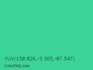 YUV 158.826,-3.365,-87.547 Color is a normal green color and the nearest color is Shamrock #33cc99. Hex code #3bd398 and RGB value is rgb(59,211,152). In RGB color space, this color is composed of 23% red, 83% green, 60% blue, In CMYK color space, this color is composed of 72% cyan, 0% magenta, 28% yellow , 17% black , In HSL color space, this color has a hue angle of 157° , 63% saturation and 53% lightness.