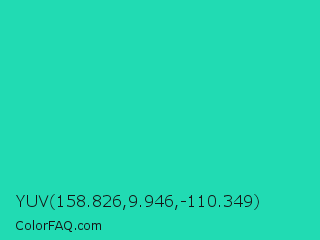 YUV 158.826,9.946,-110.349 Color is a normal cyan color and the nearest color is Turquoise PWG #30d5c8. Hex code #21dbb3 and RGB value is rgb(33,219,179). In RGB color space, this color is composed of 13% red, 86% green, 70% blue, In CMYK color space, this color is composed of 85% cyan, 0% magenta, 18% yellow , 14% black , In HSL color space, this color has a hue angle of 167° , 74% saturation and 49% lightness.