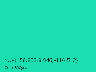 YUV 158.853,8.946,-116.512 Color is a normal cyan color and the nearest color is Turquoise PWG #30d5c8. Hex code #1adfb1 and RGB value is rgb(26,223,177). In RGB color space, this color is composed of 10% red, 87% green, 69% blue, In CMYK color space, this color is composed of 88% cyan, 0% magenta, 21% yellow , 13% black , In HSL color space, this color has a hue angle of 166° , 79% saturation and 49% lightness.