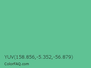 YUV 158.856,-5.352,-56.879 Color is a normal green color and the nearest color is Silver Tree #66b58f. Hex code #5ec294 and RGB value is rgb(94,194,148). In RGB color space, this color is composed of 37% red, 76% green, 58% blue, In CMYK color space, this color is composed of 52% cyan, 0% magenta, 24% yellow , 24% black , In HSL color space, this color has a hue angle of 152° , 45% saturation and 56% lightness.