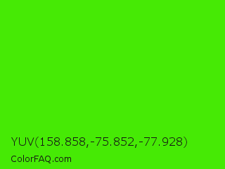 YUV 158.858,-75.852,-77.928 Color is a normal green color and the nearest color is Chlorophyll Green #4aff00. Hex code #46ea05 and RGB value is rgb(70,234,5). In RGB color space, this color is composed of 27% red, 92% green, 2% blue, In CMYK color space, this color is composed of 70% cyan, 0% magenta, 98% yellow , 8% black , In HSL color space, this color has a hue angle of 103° , 96% saturation and 47% lightness.