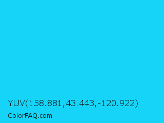 YUV 158.881,43.443,-120.922 Color is a normal cyan color and the nearest color is Spiro Disco Ball #0fc0fc. Hex code #15d4f7 and RGB value is rgb(21,212,247). In RGB color space, this color is composed of 8% red, 83% green, 97% blue, In CMYK color space, this color is composed of 91% cyan, 14% magenta, 0% yellow , 3% black , In HSL color space, this color has a hue angle of 189° , 93% saturation and 53% lightness.