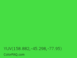 YUV 158.882,-45.298,-77.95 Color is a normal green color and the nearest color is Lime Green #32cd32. Hex code #46de43 and RGB value is rgb(70,222,67). In RGB color space, this color is composed of 27% red, 87% green, 26% blue, In CMYK color space, this color is composed of 68% cyan, 0% magenta, 70% yellow , 13% black , In HSL color space, this color has a hue angle of 119° , 70% saturation and 57% lightness.