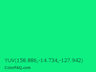 YUV 158.886,-14.734,-127.942 Color is a normal green color and the nearest color is Spring Green #00ff7f. Hex code #0def81 and RGB value is rgb(13,239,129). In RGB color space, this color is composed of 5% red, 94% green, 51% blue, In CMYK color space, this color is composed of 95% cyan, 0% magenta, 46% yellow , 6% black , In HSL color space, this color has a hue angle of 151° , 90% saturation and 49% lightness.
