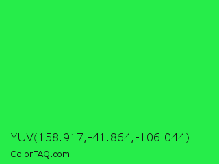 YUV 158.917,-41.864,-106.044 Color is a normal green color and the nearest color is Malachite #0bda51. Hex code #26ed4a and RGB value is rgb(38,237,74). In RGB color space, this color is composed of 15% red, 93% green, 29% blue, In CMYK color space, this color is composed of 84% cyan, 0% magenta, 69% yellow , 7% black , In HSL color space, this color has a hue angle of 131° , 85% saturation and 54% lightness.