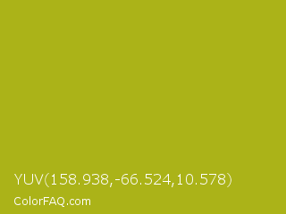 YUV 158.938,-66.524,10.578 Color is a normal yellow color and the nearest color is Acid Green #b0bf1a. Hex code #abb318 and RGB value is rgb(171,179,24). In RGB color space, this color is composed of 67% red, 70% green, 9% blue, In CMYK color space, this color is composed of 4% cyan, 0% magenta, 87% yellow , 30% black , In HSL color space, this color has a hue angle of 63° , 76% saturation and 40% lightness.