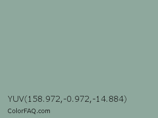 YUV 158.972,-0.972,-14.884 Color is a light green color and the nearest color is Morning Blue #8da399. Hex code #8ea89d and RGB value is rgb(142,168,157). In RGB color space, this color is composed of 56% red, 66% green, 62% blue, In CMYK color space, this color is composed of 15% cyan, 0% magenta, 7% yellow , 34% black , In HSL color space, this color has a hue angle of 155° , 13% saturation and 61% lightness.