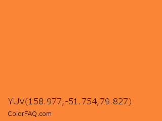 YUV 158.977,-51.754,79.827 Color is a normal orange color and the nearest color is Crusta #fd7b33. Hex code #fa8536 and RGB value is rgb(250,133,54). In RGB color space, this color is composed of 98% red, 52% green, 21% blue, In CMYK color space, this color is composed of 0% cyan, 47% magenta, 78% yellow , 2% black , In HSL color space, this color has a hue angle of 24° , 95% saturation and 60% lightness.