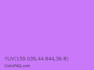 YUV 159.039,44.844,36.8 Color is a light purple color and the nearest color is Heliotrope #df73ff. Hex code #c978fa and RGB value is rgb(201,120,250). In RGB color space, this color is composed of 79% red, 47% green, 98% blue, In CMYK color space, this color is composed of 20% cyan, 52% magenta, 0% yellow , 2% black , In HSL color space, this color has a hue angle of 277° , 93% saturation and 73% lightness.