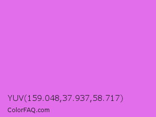YUV 159.048,37.937,58.717 Color is a light magenta color and the nearest color is Heliotrope #df73ff. Hex code #e26eec and RGB value is rgb(226,110,236). In RGB color space, this color is composed of 89% red, 43% green, 93% blue, In CMYK color space, this color is composed of 4% cyan, 53% magenta, 0% yellow , 7% black , In HSL color space, this color has a hue angle of 295° , 77% saturation and 68% lightness.