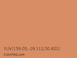 YUV 159.05,-29.112,50.822 Color is a light orange color and the nearest color is Copperfield #da8a67. Hex code #d98d64 and RGB value is rgb(217,141,100). In RGB color space, this color is composed of 85% red, 55% green, 39% blue, In CMYK color space, this color is composed of 0% cyan, 35% magenta, 54% yellow , 15% black , In HSL color space, this color has a hue angle of 21° , 61% saturation and 62% lightness.