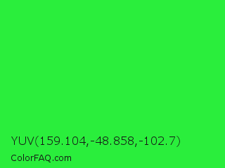 YUV 159.104,-48.858,-102.7 Color is a normal green color and the nearest color is Lime Green #32cd32. Hex code #2aee3c and RGB value is rgb(42,238,60). In RGB color space, this color is composed of 16% red, 93% green, 24% blue, In CMYK color space, this color is composed of 82% cyan, 0% magenta, 75% yellow , 7% black , In HSL color space, this color has a hue angle of 126° , 85% saturation and 55% lightness.