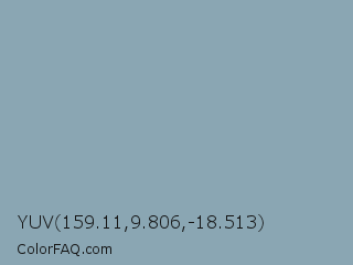 YUV 159.11,9.806,-18.513 Color is a light blue color and the nearest color is Pewter Blue #8ba8b7. Hex code #8aa6b3 and RGB value is rgb(138,166,179). In RGB color space, this color is composed of 54% red, 65% green, 70% blue, In CMYK color space, this color is composed of 23% cyan, 7% magenta, 0% yellow , 30% black , In HSL color space, this color has a hue angle of 199° , 21% saturation and 62% lightness.