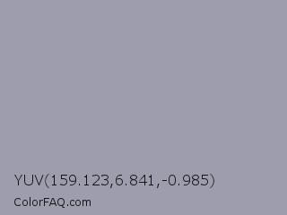 YUV 159.123,6.841,-0.985 Color is a light indigo color and the nearest color is Santas Gray #9fa0b1. Hex code #9e9dad and RGB value is rgb(158,157,173). In RGB color space, this color is composed of 62% red, 62% green, 68% blue, In CMYK color space, this color is composed of 9% cyan, 9% magenta, 0% yellow , 32% black , In HSL color space, this color has a hue angle of 244° , 9% saturation and 65% lightness.