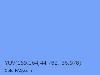 YUV 159.164,44.782,-36.978 Color is a light blue color and the nearest color is French Sky Blue #77b5fe. Hex code #75a3fa and RGB value is rgb(117,163,250). In RGB color space, this color is composed of 46% red, 64% green, 98% blue, In CMYK color space, this color is composed of 53% cyan, 35% magenta, 0% yellow , 2% black , In HSL color space, this color has a hue angle of 219° , 93% saturation and 72% lightness.
