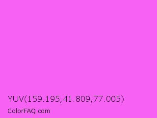 YUV 159.195,41.809,77.005 Color is a light magenta color and the nearest color is Pink Flamingo Crayola #ff66ff. Hex code #f762f4 and RGB value is rgb(247,98,244). In RGB color space, this color is composed of 97% red, 38% green, 96% blue, In CMYK color space, this color is composed of 0% cyan, 60% magenta, 1% yellow , 3% black , In HSL color space, this color has a hue angle of 301° , 90% saturation and 68% lightness.