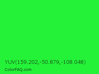 YUV 159.202,-50.879,-108.048 Color is a normal green color and the nearest color is Lime Green #32cd32. Hex code #24f238 and RGB value is rgb(36,242,56). In RGB color space, this color is composed of 14% red, 95% green, 22% blue, In CMYK color space, this color is composed of 85% cyan, 0% magenta, 77% yellow , 5% black , In HSL color space, this color has a hue angle of 126° , 89% saturation and 55% lightness.