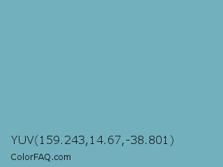 YUV 159.243,14.67,-38.801 Color is a normal cyan color and the nearest color is Moonstone Blue #73a9c2. Hex code #73b0bd and RGB value is rgb(115,176,189). In RGB color space, this color is composed of 45% red, 69% green, 74% blue, In CMYK color space, this color is composed of 39% cyan, 7% magenta, 0% yellow , 26% black , In HSL color space, this color has a hue angle of 191° , 36% saturation and 60% lightness.