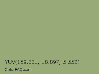 YUV 159.331,-18.897,-5.552 Color is a normal green color and the nearest color is Sage #9ea587. Hex code #99aa79 and RGB value is rgb(153,170,121). In RGB color space, this color is composed of 60% red, 67% green, 47% blue, In CMYK color space, this color is composed of 10% cyan, 0% magenta, 29% yellow , 33% black , In HSL color space, this color has a hue angle of 81° , 22% saturation and 57% lightness.