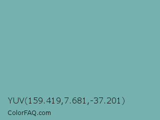 YUV 159.419,7.681,-37.201 Color is a normal cyan color and the nearest color is Gulf Stream #80b3ae. Hex code #75b2af and RGB value is rgb(117,178,175). In RGB color space, this color is composed of 46% red, 70% green, 69% blue, In CMYK color space, this color is composed of 34% cyan, 0% magenta, 2% yellow , 30% black , In HSL color space, this color has a hue angle of 177° , 28% saturation and 58% lightness.