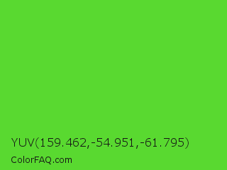 YUV 159.462,-54.951,-61.795 Color is a normal green color and the nearest color is Harlequin Green #46cb18. Hex code #59d930 and RGB value is rgb(89,217,48). In RGB color space, this color is composed of 35% red, 85% green, 19% blue, In CMYK color space, this color is composed of 59% cyan, 0% magenta, 78% yellow , 15% black , In HSL color space, this color has a hue angle of 105° , 69% saturation and 52% lightness.