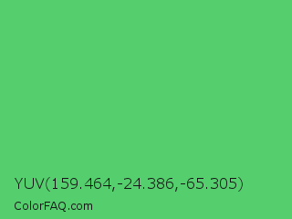 YUV 159.464,-24.386,-65.305 Color is a normal green color and the nearest color is Emerald #50c878. Hex code #55cf6e and RGB value is rgb(85,207,110). In RGB color space, this color is composed of 33% red, 81% green, 43% blue, In CMYK color space, this color is composed of 59% cyan, 0% magenta, 47% yellow , 19% black , In HSL color space, this color has a hue angle of 132° , 56% saturation and 57% lightness.