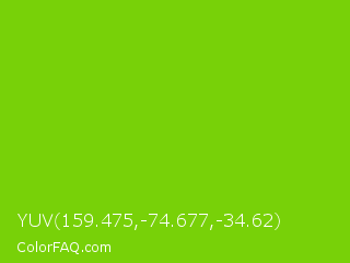 YUV 159.475,-74.677,-34.62 Color is a normal green color and the nearest color is Alien Armpit #84de02. Hex code #78d108 and RGB value is rgb(120,209,8). In RGB color space, this color is composed of 47% red, 82% green, 3% blue, In CMYK color space, this color is composed of 43% cyan, 0% magenta, 96% yellow , 18% black , In HSL color space, this color has a hue angle of 87° , 93% saturation and 43% lightness.