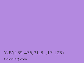 YUV 159.476,31.81,17.123 Color is a light violet color and the nearest color is Lavender #b57edc. Hex code #b389e0 and RGB value is rgb(179,137,224). In RGB color space, this color is composed of 70% red, 54% green, 88% blue, In CMYK color space, this color is composed of 20% cyan, 39% magenta, 0% yellow , 12% black , In HSL color space, this color has a hue angle of 269° , 58% saturation and 71% lightness.