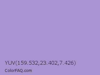 YUV 159.532,23.402,7.426 Color is a light violet color and the nearest color is East Side #ac91ce. Hex code #a892cf and RGB value is rgb(168,146,207). In RGB color space, this color is composed of 66% red, 57% green, 81% blue, In CMYK color space, this color is composed of 19% cyan, 29% magenta, 0% yellow , 19% black , In HSL color space, this color has a hue angle of 262° , 39% saturation and 69% lightness.