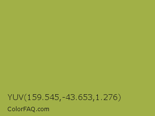 YUV 159.545,-43.653,1.276 Color is a normal yellow color and the nearest color is Brass #b5a642. Hex code #a1b047 and RGB value is rgb(161,176,71). In RGB color space, this color is composed of 63% red, 69% green, 28% blue, In CMYK color space, this color is composed of 9% cyan, 0% magenta, 60% yellow , 31% black , In HSL color space, this color has a hue angle of 69° , 43% saturation and 48% lightness.