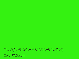 YUV 159.54,-70.272,-94.313 Color is a normal green color and the nearest color is Neon Green #39ff14. Hex code #34f211 and RGB value is rgb(52,242,17). In RGB color space, this color is composed of 20% red, 95% green, 7% blue, In CMYK color space, this color is composed of 79% cyan, 0% magenta, 93% yellow , 5% black , In HSL color space, this color has a hue angle of 111° , 90% saturation and 51% lightness.