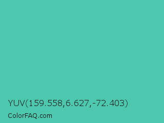 YUV 159.558,6.627,-72.403 Color is a normal cyan color and the nearest color is Puerto Rico #3fc1aa. Hex code #4dc7ad and RGB value is rgb(77,199,173). In RGB color space, this color is composed of 30% red, 78% green, 68% blue, In CMYK color space, this color is composed of 61% cyan, 0% magenta, 13% yellow , 22% black , In HSL color space, this color has a hue angle of 167° , 52% saturation and 54% lightness.