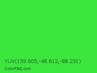 YUV 159.605,-48.612,-88.231 Color is a normal green color and the nearest color is Lime Green #32cd32. Hex code #3be63d and RGB value is rgb(59,230,61). In RGB color space, this color is composed of 23% red, 90% green, 24% blue, In CMYK color space, this color is composed of 74% cyan, 0% magenta, 73% yellow , 10% black , In HSL color space, this color has a hue angle of 121° , 77% saturation and 57% lightness.