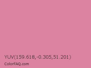 YUV 159.618,-0.305,51.201 Color is a light rose color and the nearest color is Shimmering Blush #d98695. Hex code #da829f and RGB value is rgb(218,130,159). In RGB color space, this color is composed of 85% red, 51% green, 62% blue, In CMYK color space, this color is composed of 0% cyan, 40% magenta, 27% yellow , 15% black , In HSL color space, this color has a hue angle of 340° , 54% saturation and 68% lightness.