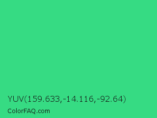 YUV 159.633,-14.116,-92.64 Color is a normal green color and the nearest color is UFO Green #3cd070. Hex code #36db83 and RGB value is rgb(54,219,131). In RGB color space, this color is composed of 21% red, 86% green, 51% blue, In CMYK color space, this color is composed of 75% cyan, 0% magenta, 40% yellow , 14% black , In HSL color space, this color has a hue angle of 148° , 70% saturation and 54% lightness.