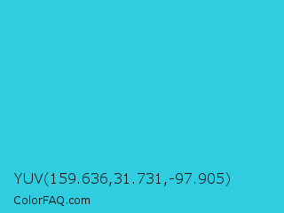 YUV 159.636,31.731,-97.905 Color is a normal cyan color and the nearest color is Scooter #2ebfd4. Hex code #30cce0 and RGB value is rgb(48,204,224). In RGB color space, this color is composed of 19% red, 80% green, 88% blue, In CMYK color space, this color is composed of 79% cyan, 9% magenta, 0% yellow , 12% black , In HSL color space, this color has a hue angle of 187° , 74% saturation and 53% lightness.