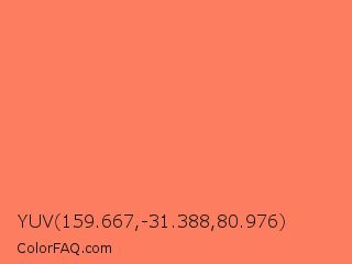 YUV 159.667,-31.388,80.976 Color is a light red color and the nearest color is Coral Reef Hipster Salmon #fd7c6e. Hex code #fc7d60 and RGB value is rgb(252,125,96). In RGB color space, this color is composed of 99% red, 49% green, 38% blue, In CMYK color space, this color is composed of 0% cyan, 50% magenta, 62% yellow , 1% black , In HSL color space, this color has a hue angle of 11° , 96% saturation and 68% lightness.