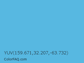 YUV 159.671,32.207,-63.732 Color is a light blue color and the nearest color is Blue Jeans #5dadec. Hex code #57b8e1 and RGB value is rgb(87,184,225). In RGB color space, this color is composed of 34% red, 72% green, 88% blue, In CMYK color space, this color is composed of 61% cyan, 18% magenta, 0% yellow , 12% black , In HSL color space, this color has a hue angle of 198° , 70% saturation and 61% lightness.