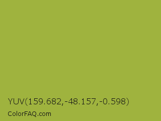 YUV 159.682,-48.157,-0.598 Color is a normal yellow color and the nearest color is Android Green #a4c639. Hex code #9fb33e and RGB value is rgb(159,179,62). In RGB color space, this color is composed of 62% red, 70% green, 24% blue, In CMYK color space, this color is composed of 11% cyan, 0% magenta, 65% yellow , 30% black , In HSL color space, this color has a hue angle of 70° , 49% saturation and 47% lightness.