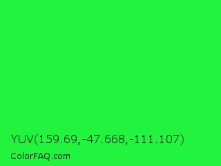 YUV 159.69,-47.668,-111.107 Color is a normal green color and the nearest color is Malachite #0bda51. Hex code #21f33f and RGB value is rgb(33,243,63). In RGB color space, this color is composed of 13% red, 95% green, 25% blue, In CMYK color space, this color is composed of 86% cyan, 0% magenta, 74% yellow , 5% black , In HSL color space, this color has a hue angle of 129° , 90% saturation and 54% lightness.