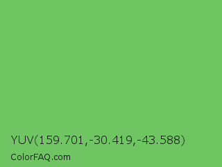 YUV 159.701,-30.419,-43.588 Color is a normal green color and the nearest color is Mantis #74c365. Hex code #6ec562 and RGB value is rgb(110,197,98). In RGB color space, this color is composed of 43% red, 77% green, 38% blue, In CMYK color space, this color is composed of 44% cyan, 0% magenta, 50% yellow , 23% black , In HSL color space, this color has a hue angle of 113° , 46% saturation and 58% lightness.
