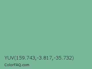 YUV 159.743,-3.817,-35.732 Color is a normal green color and the nearest color is Acapulco #7cb0a1. Hex code #77b698 and RGB value is rgb(119,182,152). In RGB color space, this color is composed of 47% red, 71% green, 60% blue, In CMYK color space, this color is composed of 35% cyan, 0% magenta, 16% yellow , 29% black , In HSL color space, this color has a hue angle of 151° , 30% saturation and 59% lightness.